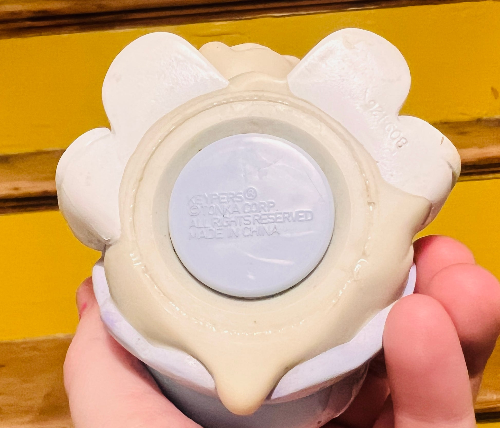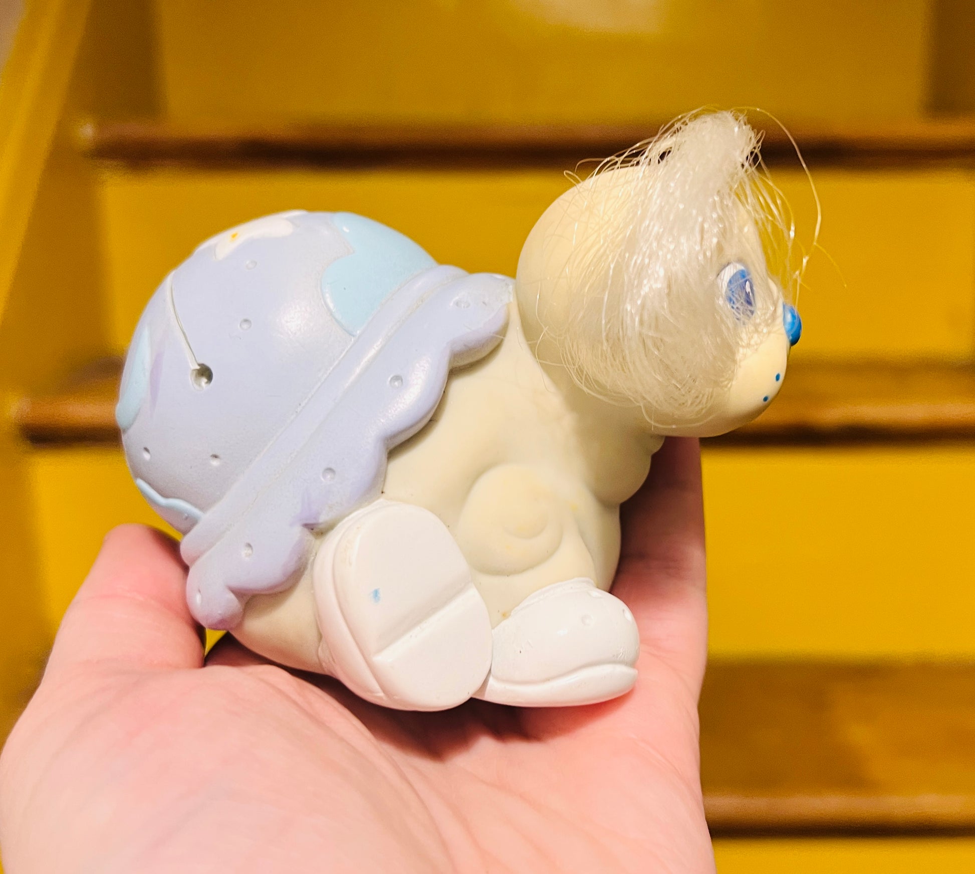 As you can see in the photos, there is slight marks on shell, small scratch on eye and nose. Otherwise in good condition! Hair still has its original curl. Very cute item!