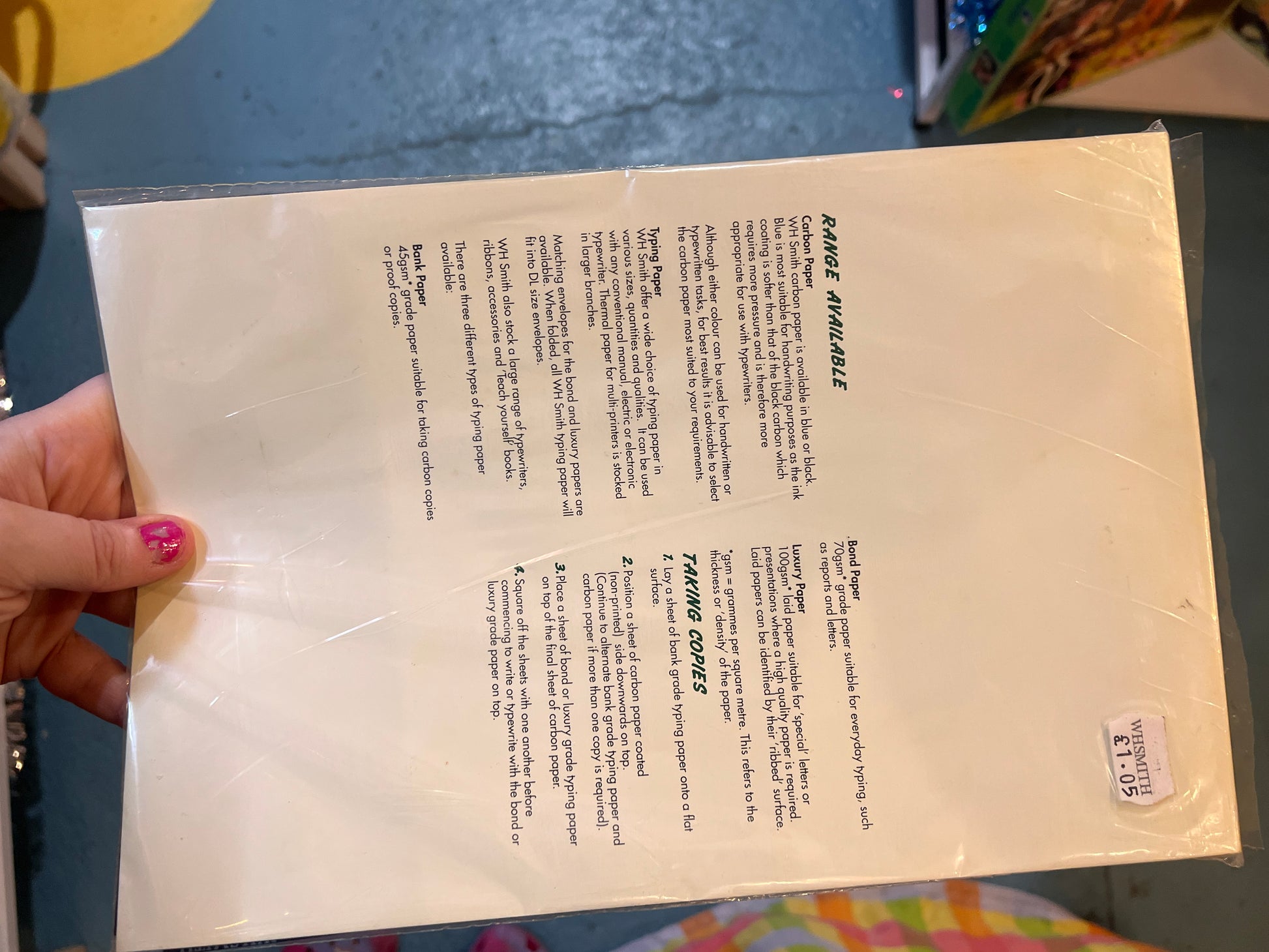 Comes with carbon paper and normal A4 paper. Comes with original instructions.