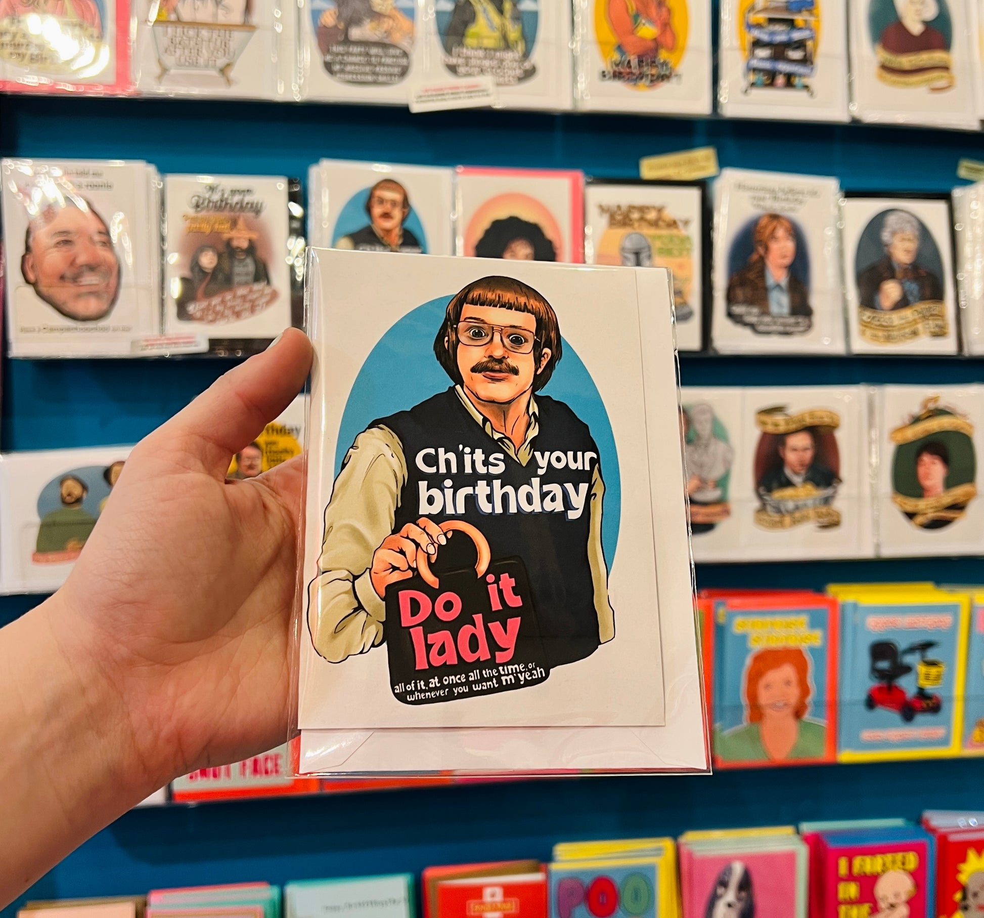 A perfect card to give to any Chit fan! This card features Chit and the iconic black purse! The Words read 'Ch’it’s Your Birthday, Do It Lady. All of it, at once all the time, or whenever you want. M’yeah’
