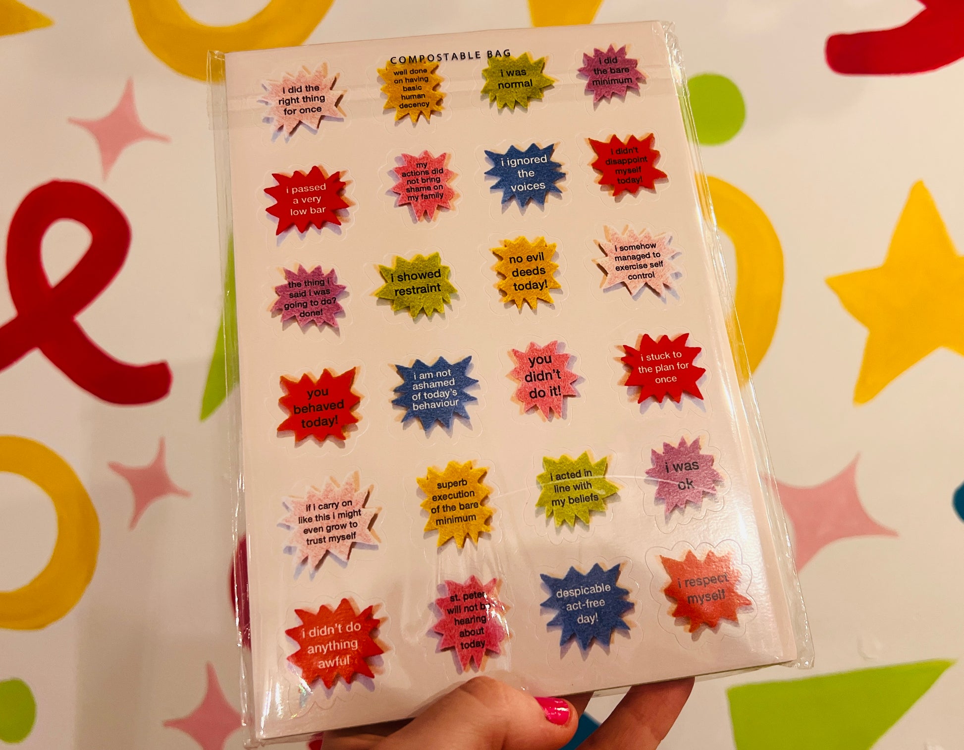 Rewarding sticker sheet features such hits as “i was ok” and “i did the bare minimum”.