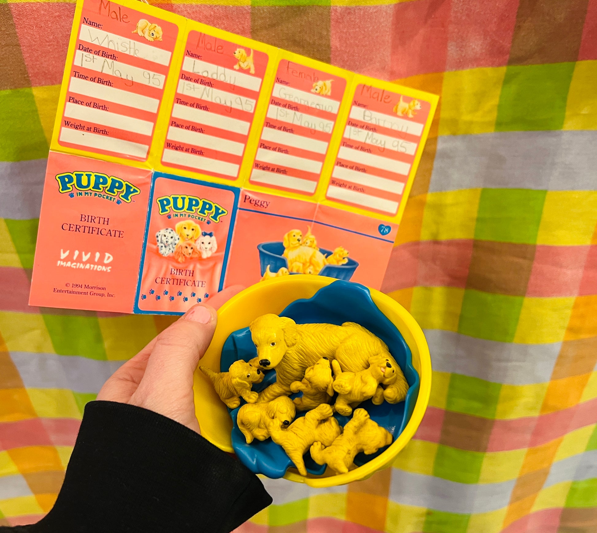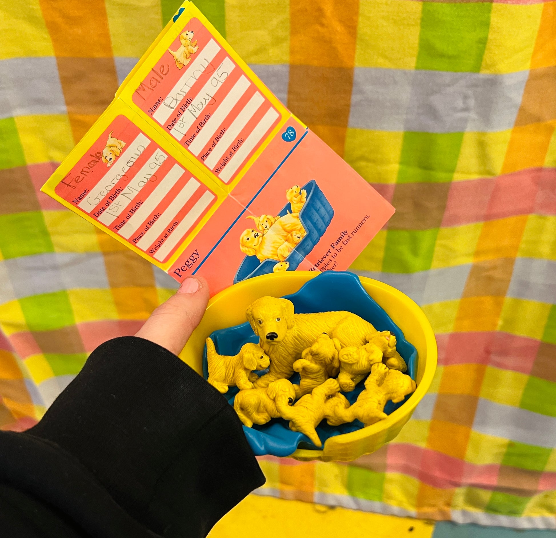 Peggy and 7 puppies with original bed and blanket. Comes with option paper (some writing on card). Please note there may be some markings on dogs, please see pics.