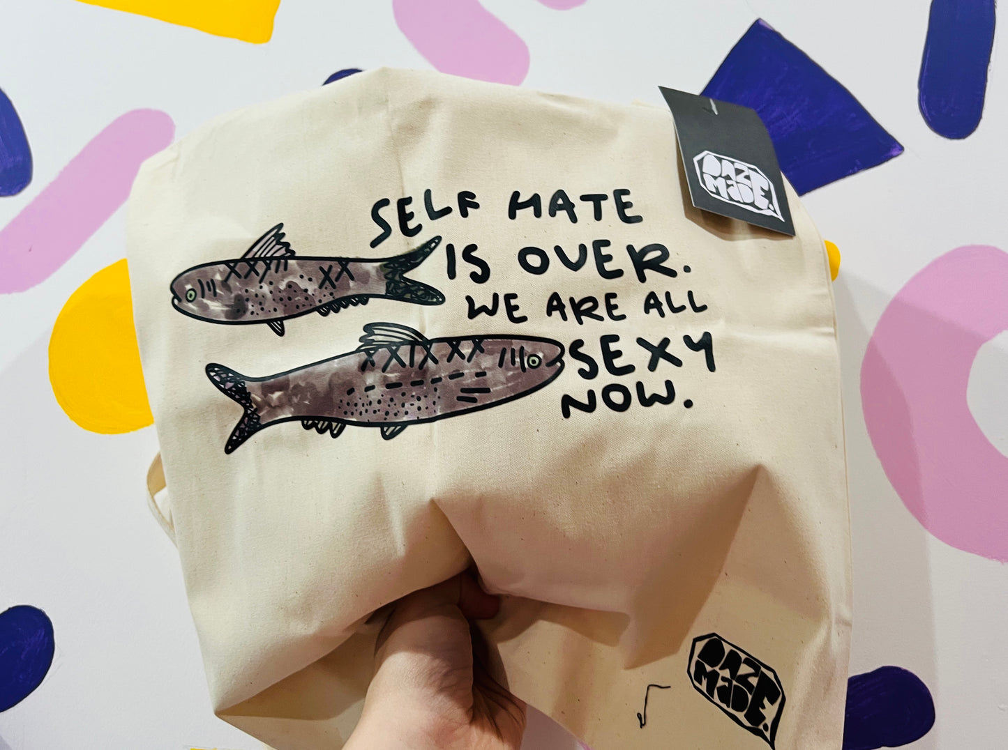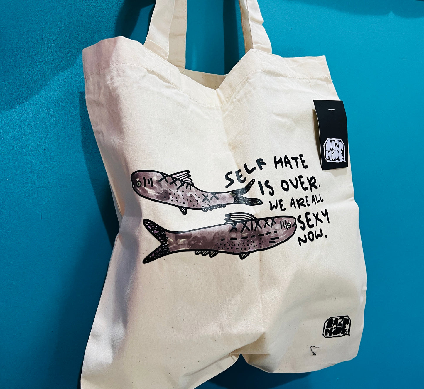 Screen printed by hand, original Self Hate is Over we are All Sexy Now fish design on a a 100% natural cotton tote bag by
