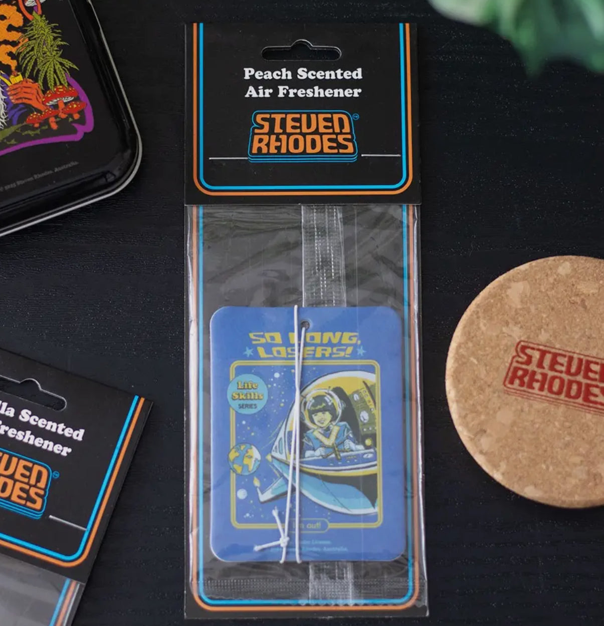 Blast off from your responsibilities in a cloud of peachy defiance. So Long Losers air freshener by Steven Rhodes is for anyone mentally checking out while physically stuck in traffic. Officially licensed and part of the Steven Rhodes collection of iconic retro gifts.