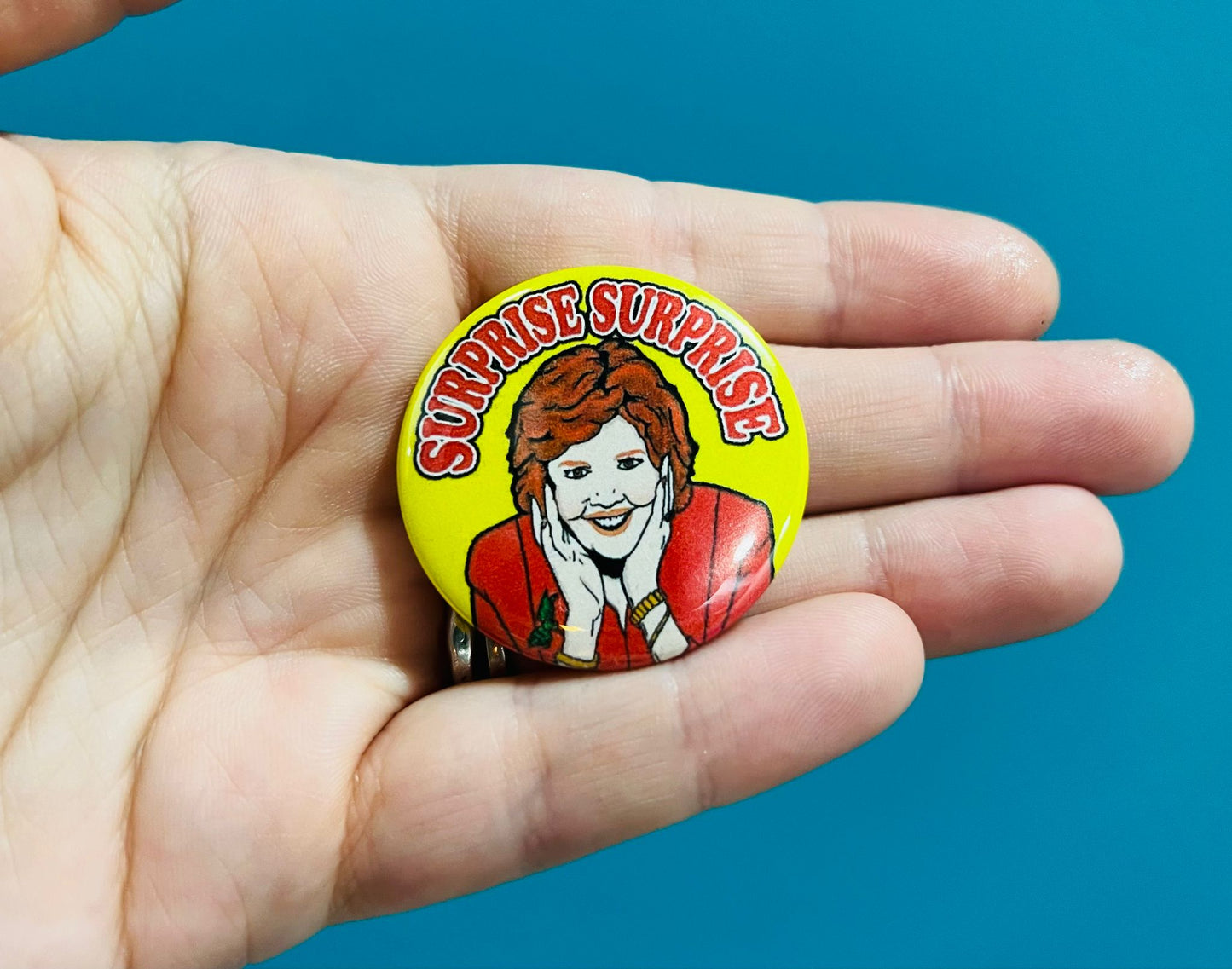 Surprise Surprise Cilla Black Inspired Pin Badge